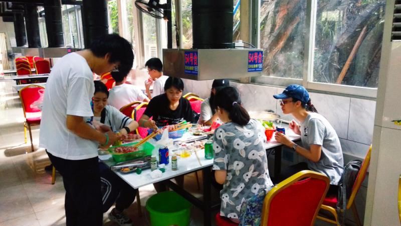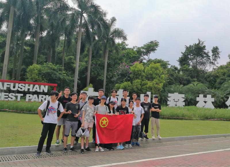 在大夫山森林公园门口,同学们高举团旗合影留念。紧接着,同学们骑上租来的自行车,围绕公园进行骑行。公园里绿树成荫,空气清新,不愧被称为“番禺氧吧”。欣赏完公园的美景,同学们也感到饥饿和疲惫了,班干部特地提前联系了附近的自助烧烤摊,同学们在烧烤摊上大快朵颐。最后,大家在夕阳的余辉下回到了五山校区。