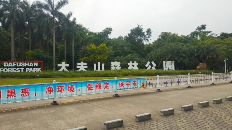 经过一个半小时的地铁、公交以及步行的路程,同学们到达了大夫山森林公园。大夫山森林公园位于广州市番禺区市桥以西三公里处,跨市桥、钟村两镇,毗邻顺德碧桂园,北与祈福新村接壤,其总面积约9000亩,是广州地区生态型森林公园。公园内连绵不断的群山环抱着,在海拔226.6米的番禺第一高峰大夫山周围,还有大小山塘和多个人工湖,从而形成了峰恋起伏、湖光倒影的景象,因此,大夫山被称为“番禺的氧吧”。