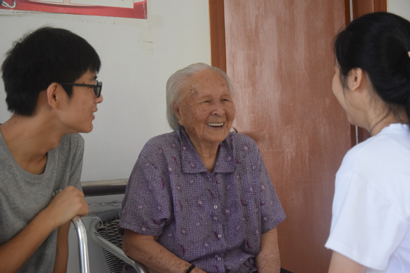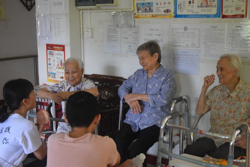 老人家最缺的便是可以倾听自己声音的人。敬老院的老人多半是广东本地人,不大会讲普通话,只能用粤语去讲述他们的趣事。食品学院的志愿者中有人当起了粤语翻译家,为听不懂粤语的志愿者翻译老人家的故事。他们坐在小凳上,与老人家们唠家常,听可爱的老奶奶“讲段子”。老人饱经风霜的脸上绽开了一丛笑,褶皱前额之下的那双眼睛慢慢放出光来,温润而祥和——无声地告诉了我们,什么是温暖与幸福。
