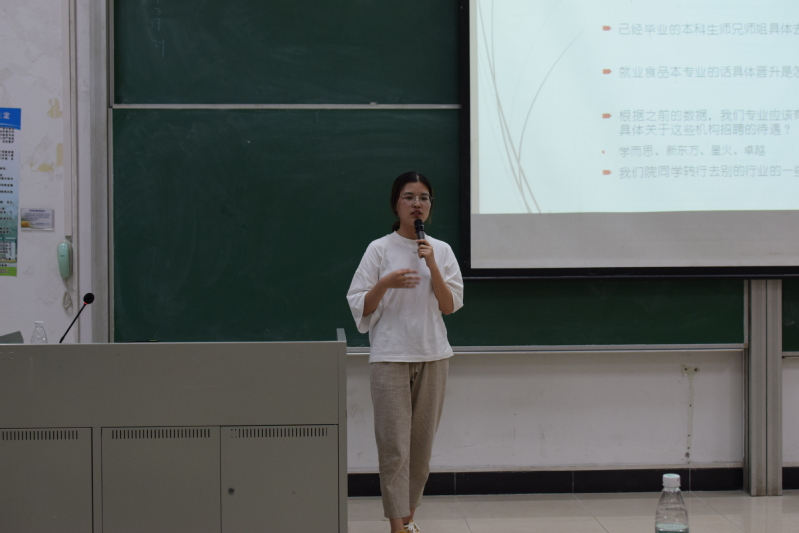 2019年6月15日19时,食品科学与工程学院在330102教室成功举行了“食品学院2019年读研就业交流会”。此次交流会通过分享优秀毕业生代表的经历,为16——18级本科生提供读研就业参考,以经验交流、读研就业信息共享、帮助指导为目的,旨在为我院就读本科生理清未来发展道路、为其未来规划提供参考样例。出席本次会议的嘉宾有学生会主席王炳旭师兄、副主席林瑾师姐、副主席陈奕敏师姐、团委副书记张昊苏师兄,以及优秀读研就业毕业生代表陈晓琦师姐、屈子尧师姐、余青紫师姐、汪芷因师姐、张庭钰师姐。