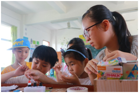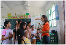 图为志愿者给孩子们讲授食品添加剂知识 图为领队老师带孩子们玩游戏
