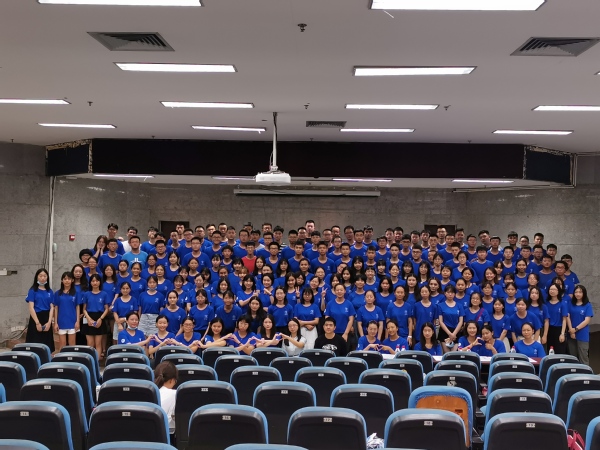 郭老师精彩的演讲之后便到了有趣好玩的破冰游戏。首先进行的是“你是谁”活动:2020级新生10个人为一组,每个组的成员一次介绍自己的姓名,后面一人必须记住前面所有人的姓名并复述,之后再介绍自己的姓名。若有同学无法完整复述前面同学名字则将要进行才艺展示。活动开始后,同学们便开始了紧张刺激的游戏。有的绞尽脑汁思考,有的开心地咧嘴大笑,教室里回荡着同学们欢乐的笑声。活动结束后,还有一位男同学主动上台为大家带来歌曲《绅士》,美妙的歌声和真挚的情感使台下所有人陶醉其中,沉醉不已。紧接着进行的便是“青春点名册”活动:参加者围成一个圆圈坐着,所有组员依次说一句话介绍自己,全部介绍完后由小组长制定任意一个人边上的第几任说出此人姓名和其他已知信息。依次继续,答错的同学若超过五秒未答的同学将要接受惩罚。通过这个游戏,新生可以更加深入地了解到彼此,还可以得知对方的兴趣爱好及特长。20:20时,活动便走向了尾声,新生们站在讲台合影留念,将最美好的笑容定格在照片中。20:30活动结束。