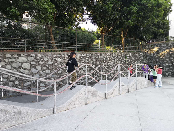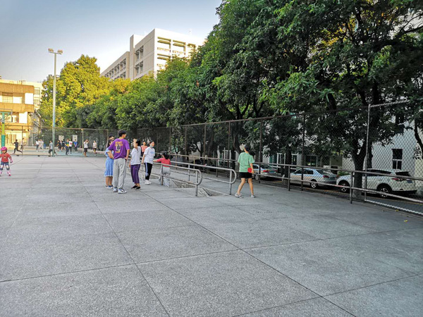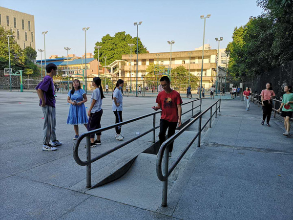 为保证不会出现游戏拥堵,即很多组都在等待同一个游戏的情况,负责人在活动前告知了每个组他们的初始游戏。一、二组先是参加折返跑并答题的游戏,每组成员在起跑线站成一列,三分钟内在滑轮场凸起坡上进行接力折返跑,在终点处答题后立即跑回起点,并由下一位同学接力,直至时间结束,以答对题数计分;三、四组首先参加的是踢毽球游戏,参赛者在距离目标2米处,将毽球踢入直径为20,40,60,80厘米的圆心中,最后落在同心圆中就得分,从内到外依次以5,3,2,1计分,每组共有十次机会;而五、六组先进行的是运乒乓球游戏,游戏规则为:每组队员分别站在滑轮场下凹破的两头,游戏开始后需用本组抽到的方式运球,运到对面并交给下一位,若球中途掉落则重来,直至最后一个人运完球,计时结束。比赛开始前,选一个号码,决定本组的运球道具,包括球拍、A4纸和两支笔。三、四组率先完成第一轮的游戏,进入到另一新的游戏——绑腿走。