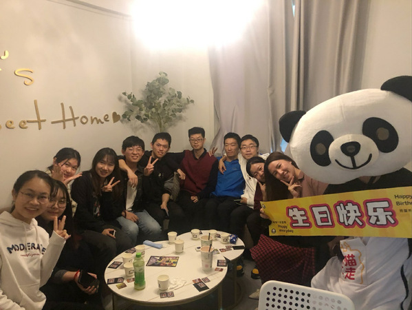当我们沉浸在游戏中时,突然走进一位装扮成熊猫的人,手里捧着一个大蛋糕,腰间挂着一个小音箱,正播放着生日祝福歌。原来是我们订的生日蛋糕到了。之后我们为11月过生日的郝欣悦同学唱了生日祝福歌,并一起吃了美味的蛋糕。