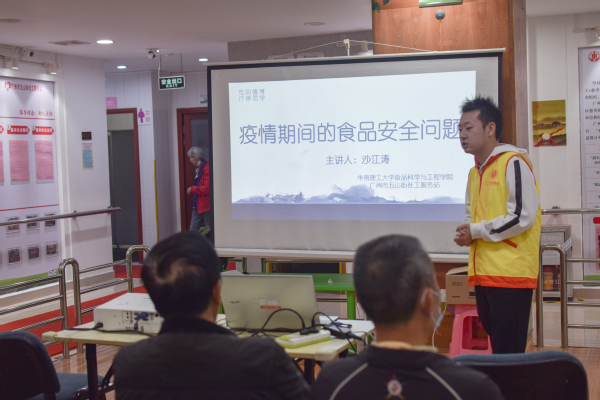 12月5日上午9时,科普介绍准时开始。此次介绍的主要内容是疫情期间的食品安全和转基因食品科普,由食品学院研分会的沙江涛师兄主讲。疫情期间的食品安全部分,沙师兄关于辨别食物状态、食品监管渠道、个人防护等部分进行了讲解;而另一部分,沙师兄简单介绍了转基因食品的定义、研发、生产、销售、监管等内容,同时也希望大家在听完宣讲之后不要再闻“转”色变。介绍结束之后,沙师兄接受了前来参加的五山居民们关于食品安全和转基因食品的疑问,他耐心地为居民们一一详细解答,对于结果没有定论的问题,他也提出了自己的看法。在活动的最后,实践部的同学们向居民们分发了小礼品并合影留念。