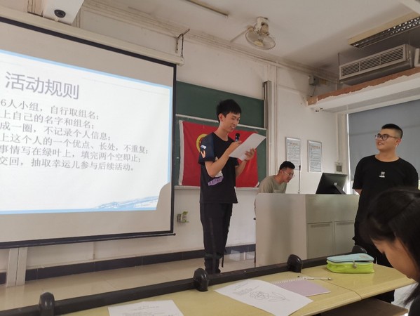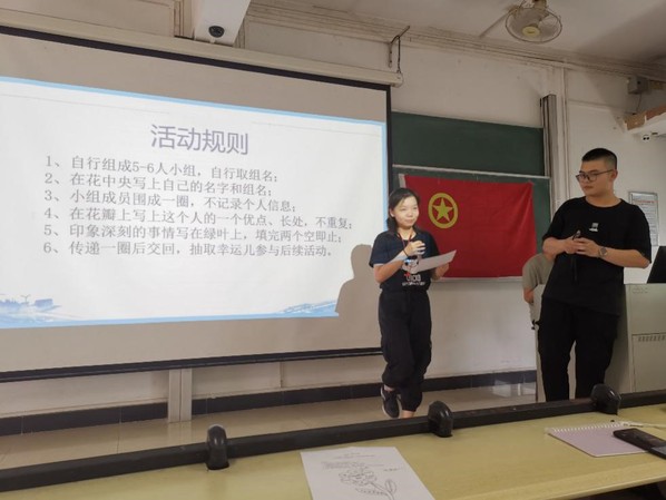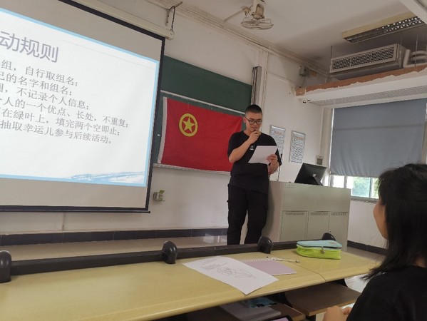 本次团日活动由团支书陈实主持,活动分为三部分:“积极学党史,展望新百年”党史答题启动仪式,“送你一朵小红花”团建活动,以及“我最喜爱的二班团日活动”四月团日评选。首先,陈实同学说明《全国大学生党史知识竞答大会》的举行时间、答题途径和要求,号召团员参与答题,同时鼓励非团员的同学踊跃参加答题。随后,活动进入高潮部分,同学们自由分成五组,参与全体团支委精心设计的“送你一朵小红花”团建活动,在同学的“小红花”上写下TA的优点、特长以及最深刻的印象,并抽取来自三组的三位同学上台分享自己得到的评价。活动的最后,同学们提出了对下一月团日活动的建议,全体同学进行投票,确定了四月团日活动的具体项目,本次团日活动取得了圆满成功。