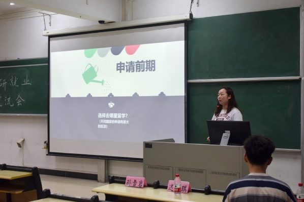 晚上7点30分,交流会正式开始。在主持人介绍完活动的大致流程后,受邀而来的嘉宾就自己所选择的道路开始经验分享。首先是读研的交流环节。缪元浩师兄主要分享他准备考研英语(一)的经验,包括推荐书目、做题刷题技巧等。而张佳慧师姐就给大家介绍了推免的主要过程,她提醒大家要注意重要的时间节点和各院校的信息发布。接着我院主要负责研究生招生工作的王方华副教授和大家进行了交流。他先是告诉大家“读研”的真正关键是在于“做研究生”,要专注于科研并为之奋斗。然后介绍了面试的流程和准备方法以及面试过程中的一些技巧。读研交流环节的内容十分充实,同学们也收获不少。
