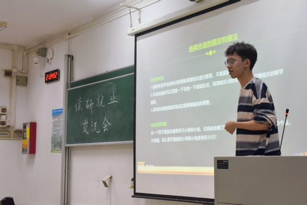 最后是关于出国和就业的经验分享。姬健菲师姐就其出国准备经验做了分享,包括学校的选择、成绩要求、申报材料等。骆俊杰师兄介绍了考取教师资格证的注意事项并分享他拿到学而思教育机构offer的历程,还生动地演示了如何讲好一道题,让大家对教师工作有了更深的了解。王国钰师兄分享了其就业的经验,他着重强调了简历的规范制作,解释了优秀的简历对于求职者的重要性。