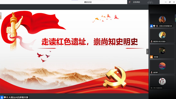 本科生党支部于2021年4月24日下午以腾讯会议举办“走读红色遗址,崇尚知史明史”交流分享会,各党小组选派的代表通过PPT围绕场馆介绍、事件梳理、重要人物及贡献、心得体会等方面向大家分享了前期本党小组参观红色遗址的情况。