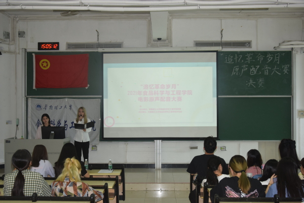2021年5月16日下午3时,食品科学与工程学院学生会秘书部于华南理工大学五山校区340204举办了以“追忆革命岁月”为主题的电影原声配音大赛决赛。本次活动到场嘉宾有:本科生辅导员郭振标老师、团委副书记冯泳钰、学生会主席谢庆彤、学生会副主席韦惠莹、学生会副主席郝欣悦。