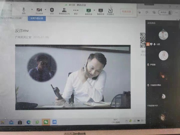 上午10点整,同学们进入腾讯会议进行签到,由班长童亦韩主持会议。首先,童亦韩同学就近期逐渐严峻的疫情情况提醒同学们要做好个人防护,建议同学们在教室、图书馆等场所也要科学戴好口罩,并再次敦促同学们填写好疫苗接种问卷,提醒还未接种的同学要尽快预约接种。随后班会通过播放广州天河公安公众号中的“反诈mv”, 生动有趣地告诉同学们防诈骗的重要性,揭示层出不穷、防不胜防的诈骗手段,同时提醒同学们要远离校园贷等套路贷,遇到黑恶势力要勇于向公安机关反映。视频中通过有趣的转场、朗朗上口的快板、悠扬的戏曲等方式,吸引同学们的注意力,激励同学们深入地学习防诈骗知识,做到绝不轻信陌生人,遇到困难要及时求助110。