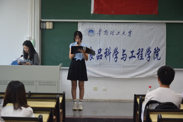 全员大会于14:30正式拉开帷幕。大会第一项为学生会副主席韦惠莹代表主席团成员致辞。韦惠莹学姐向在会全体汇报了过去一年食品团学丰硕的活动成果和获奖的荣誉称号,展示了团学在内建与外联工作上成熟完善的学生组织风采。
