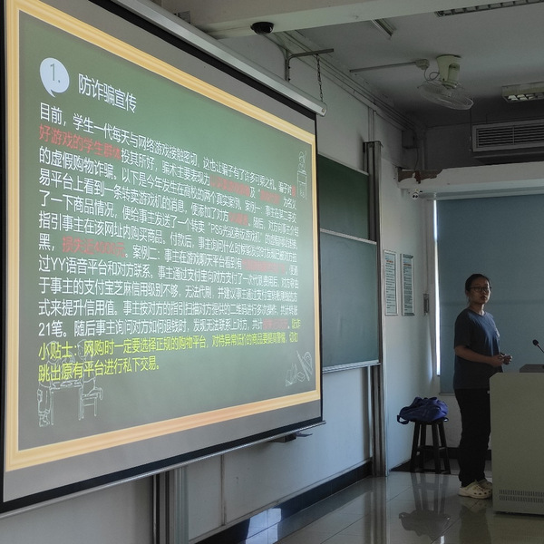 在防范电信诈骗环节,班长担当起大学城周警官的职责,列举了可能遇到诈骗的情境,警醒同学们在日常生活中多留心眼,保持冷静,保护好个人财产的安全。