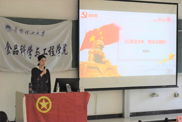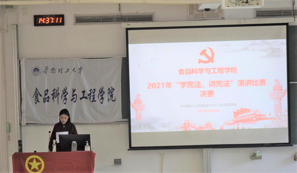 为了响应习近平总书记关于尊崇宪法、维护宪法的号召,激发当代大学生继承和发扬宪法的精神,食品科学与工程学院组织部和文联部于2021年10月16日下午3点,在华南理工大学五山校区340204教室共同举办了“学宪法,讲宪法”主题演讲比赛。出席本次活动的嘉宾有:团委副书记兼本科生辅导员邝嘉华老师、团委副书记冯泳钰、学生会副主席郝欣悦以及晋级决赛的八位同学。