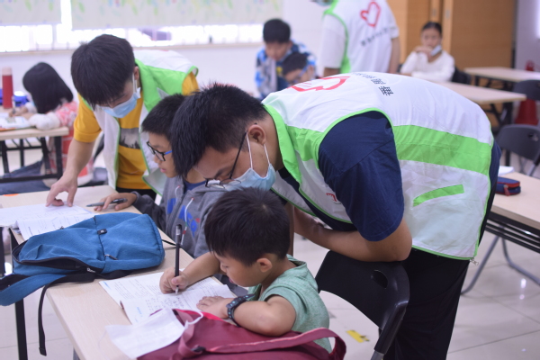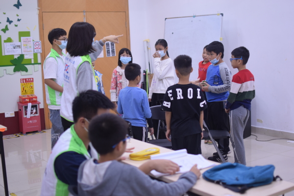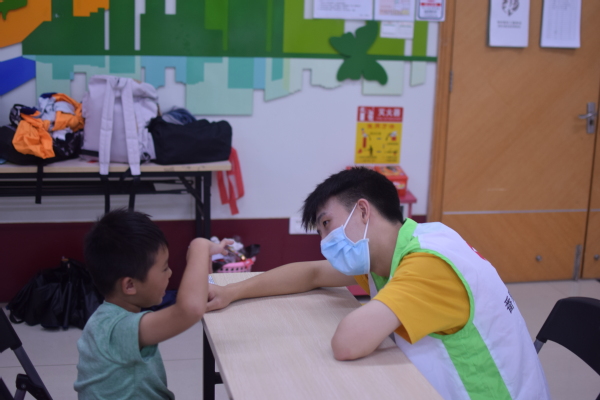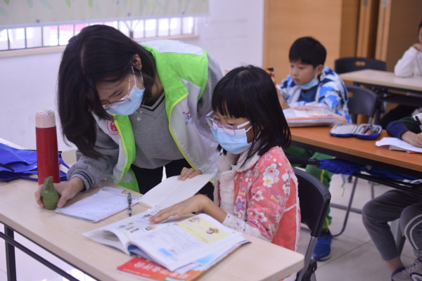 本次志愿服务活动的时长约为两小时,共分为两个环节,第一个环节为作业辅导,第二个环节为有趣的团体游戏。下午2时30分,小朋友们陆续来到了课室,志愿者们耐心地引导他们进行签到,并为他们测量体温。小朋友们安静地入座后,志愿者便督促他们完成自己的学习任务。过程中,有些小朋友看着作业本上有难度的题目,便有点走神。这个时候志愿者们耐心地走到他们身旁,温声细语地将小朋友的注意力转移到题目上,并认真地辅导他们写作业。在志愿者的帮助下,不少小朋友都成功完成了自己的学习任务,小小的脸颊上洋溢着灿烂的笑容。