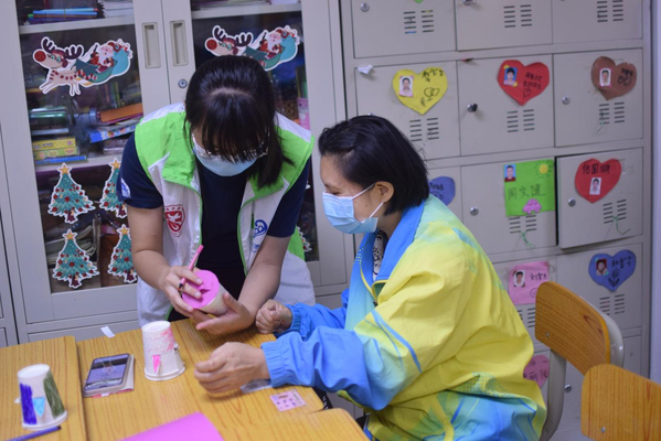 下午两点半,活动开始。实践部的彭俊瑜作为志愿者代表,亲切地用粤语做自我介绍,表达来意,康园宝宝们热情地鼓掌,表示欢迎。首先进行暖场手工活动,康园宝宝们在志愿者们的帮助下组装小企鹅。接着进行垃圾桶制作活动。康园宝宝们在志愿者们的指导下制作了四种颜色的垃圾桶,这四种颜色的垃圾桶分别代表可回收垃圾桶、有害垃圾桶、厨余垃圾桶和其他垃圾桶。接下来进行垃圾分类科普活动,志愿者彭俊瑜向康园宝宝们展示了4个精美的手工垃圾桶,用通俗易懂的话语介绍垃圾分类,康园宝宝们认真听讲,积极提问,志愿者们耐心解答,让康园宝宝们在游戏中增长知识。最后进行的是手掌画活动。志愿者们向康园宝宝们展示了“垃圾分类,环保我心”的横幅,康园宝宝们分别选择了自己喜欢的印泥,在横幅上按手印留念。快乐的时光总是短暂的,下午四点半,活动结束。康园宝宝们依依不舍地与志愿者们告别,全体志愿者返回学校。