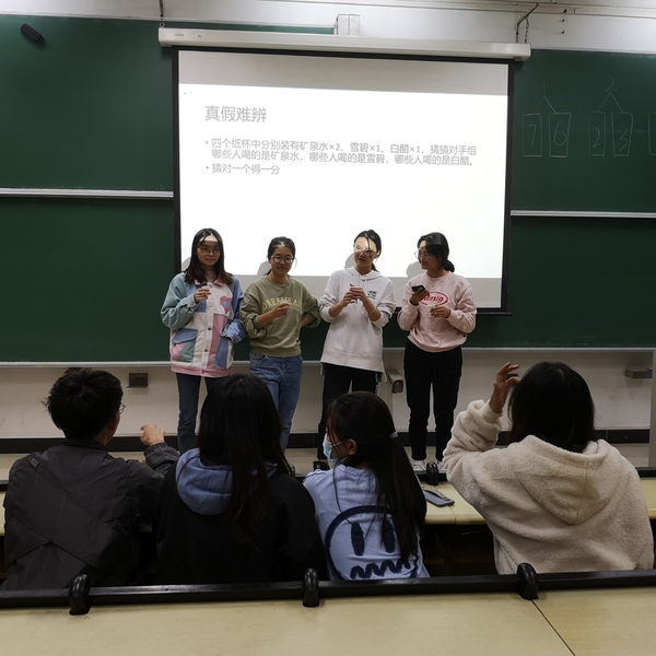 当日晚上6:40,班委们陆续到达活动现场进行场地布置和物资准备,并组织同学们签到和分组抽签,7点整班长杨书农宣布活动正式开始。本次活动主要有“你画我猜”“真假难辨”“气球大战”和“争夺水瓶”四个游戏项目,同学们按抽签结果以小组比拼的形式赢得积分,最终按积分高低决出本次活动的获胜小组,赢得奖品。