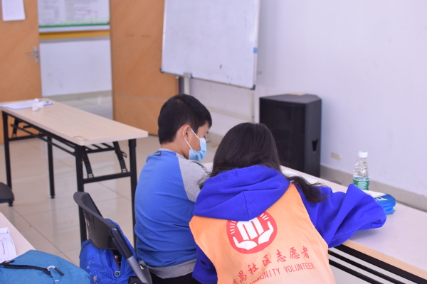 抵达社工服务站后,五名志愿者在服务站工作人员的指引下进行了活动场地的布置并换上志愿服。在参与活动的小朋友们陆续到场后,志愿者引导他们依次登记签到,有序入座。