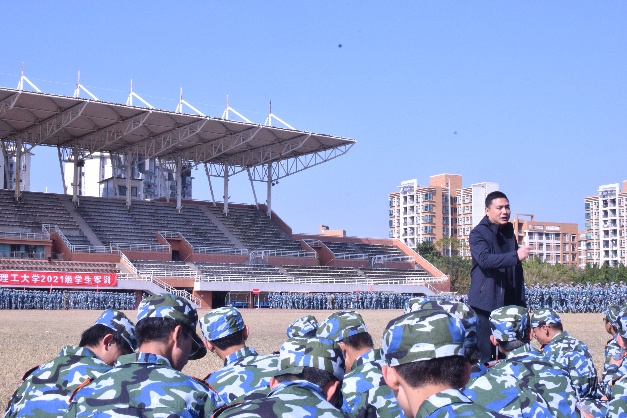 谭书记首先代表学院向同学们表达问候与关怀,学院一直高度重视本科生的军训工作,也牵挂着同学们的校园学习与生活。现在是学期末,其实也是一个关键的时期,选择这个时间段进行军训,是为了让同学们体验苦尽甘来的历程,同学们在军训以后就可以迎来寒假,回家度过一个轻松愉快的春节。谭书记亲切的预祝同学们能顺顺利利的回家,希望外省的同学们在到家以后,把广州温暖的天气和学校学院热情的问候告知朋友和家人,传递广州的风土人情和华工的人文关怀。