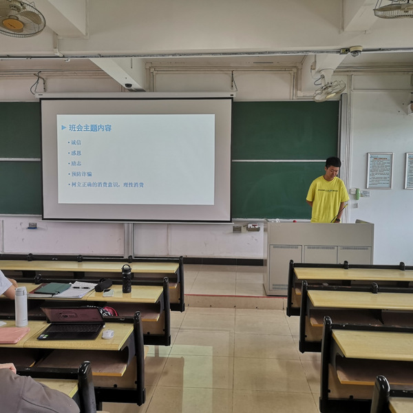 上午9时30分,同学们陆续到达教室,班会开始。本次班会由班长杨书农主持,他从诚信、感恩、励志、预防诈骗以及理性消费等方面进行讲解。首先他向同学们讲解了诚信的重要性,提到随着时代的不断发展和变化,诚实守信也被赋予了体现时代精神的新内涵。同时他提醒同学们要树立诚信观念、增强法律意识,例如要及时履行国家助学贷款合同等。随后他还引导同学们要积极主动践行社会主义核心价值观,全面发展,不断努力成为一个知足感恩、励志向上的“有温度”优秀青年。此外,杨书农同学在班会中还提醒大家要预防诈骗,远离不良贷、套路贷,提高防范不良消费贷款和电信诈骗的意识。