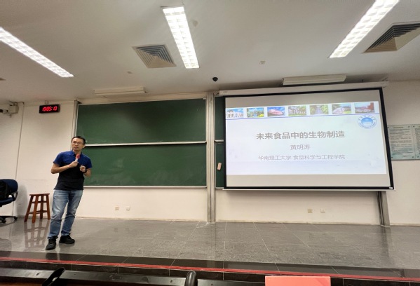 黄明涛教授从自身的学习生活经历和心路历程开始讲述,围绕“食品”巧妙地一步一步引导同学们的目光由养殖业转移到主讲对象——“人造肉”上来,向同学们讲述了人造肉出现的原因、以及目前人造肉的科研进展。此外,黄教授还深入浅出地为同学们讲解了基因工程在蛋白质改造优化上的应用,讲述过程中语言生动有趣又不乏专业知识,一场讲座听得同学们收获满满,更加坚定地投身于食品的科研之路中!
