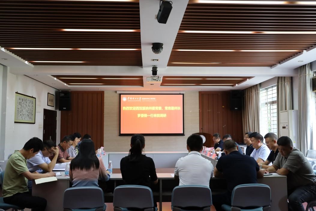 2024年10月24日下午,西双版纳州委常委、常务副州长罗景锋到访学院,州工业和信息化局、农垦局、投资促进局等单位负责人陪同,学院党政领导班子部分成员及相关教师代表参加座谈。双方围绕产学研合作等相关话题进行深入交流。