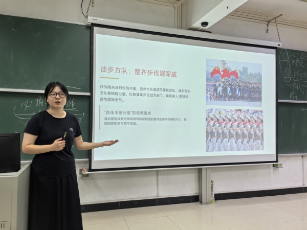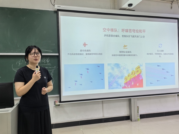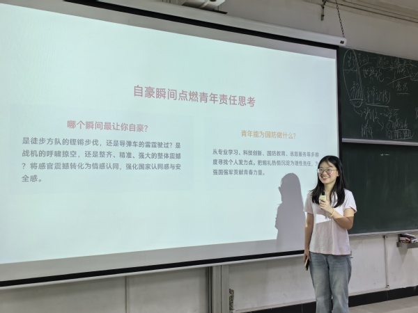 活动开始,团支书曹笠媛以PPT形式系统地介绍了2025年阅兵仪式的整体情况,分别从徒步方队、装备方队、空中梯队三个层面展开讲解。同学们特别关注到东风高超音速导弹的突防能力与精确制导技术,对其在维护国家战略安全中的作用有了更直观的理解。