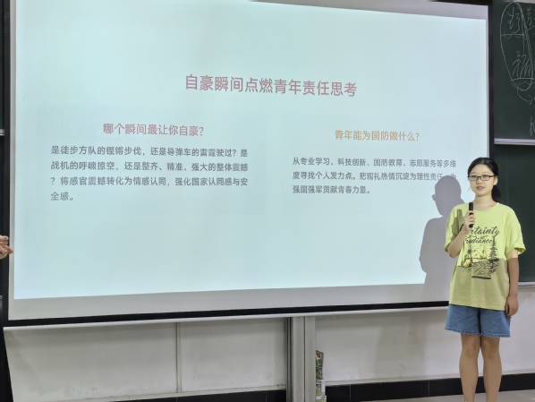 活动最后,团支书进行总结,强调新时代大学生应当以阅兵精神为激励,树立远大理想,锤炼过硬本领,把“强国有我”的誓言落实到日常学习与实践中。