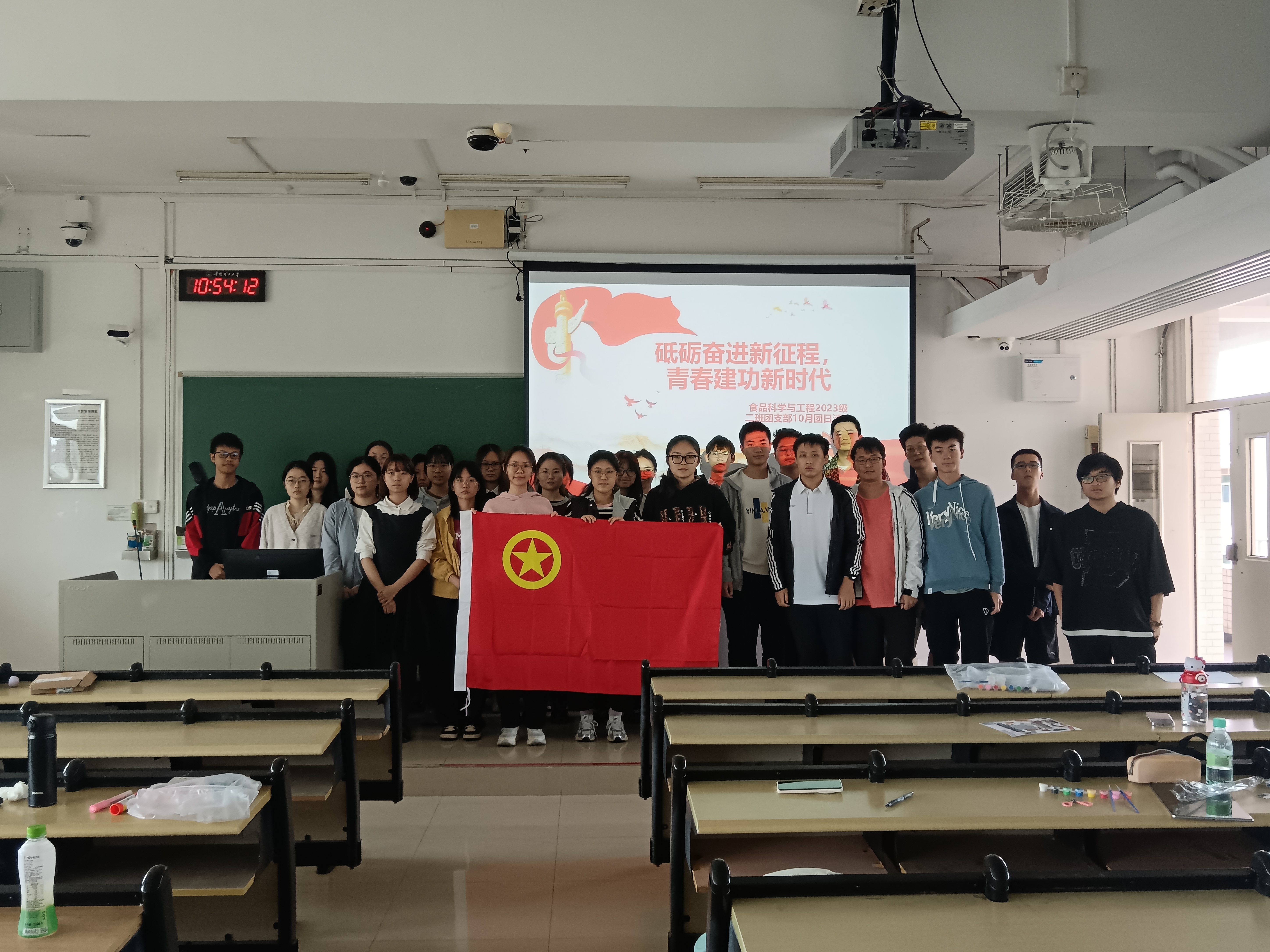 近年来,国家的繁荣发展造就了一系列的辉煌成就。作为新时代的青年大学生,特别是作为与国家民生息息相关的食品专业的学子,我们既是这些成就的见证者,更应是未来建设的参与者和贡献者。为了激发团员青年的爱国热情与使命担当,2025年10月24日,2023级食品科学与工程二班团支部在华南理工大学五山校区330601教室开展了主题为“砥砺奋进新征程,青春建功新时代”的团日活动。