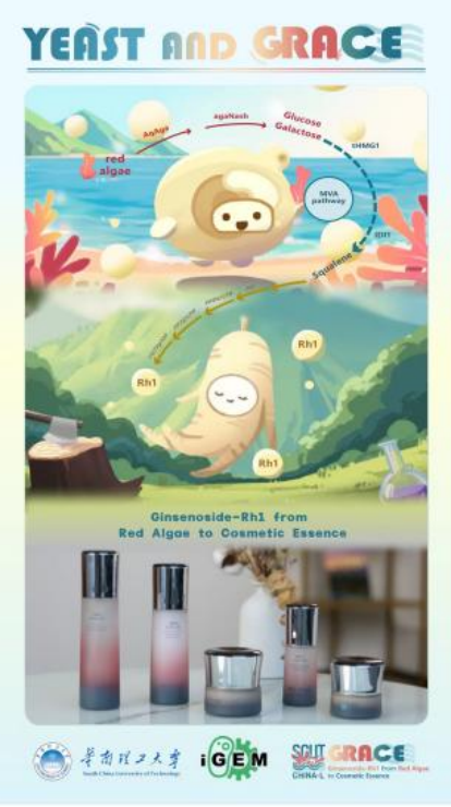 当前,稀有人参皂苷Rh1作为高端化妆品核心抗衰美白成分,其获取方法仍面临巨大挑战。从人参中直接提取效率低,化学合成污染大,SCUT-China-L团队提出利用合成生物学方法进行Rh1的绿色制备。依托“酵母代谢工程改造+红藻高值化利用”核心技术,结合软件设计与预测模型,建立了从海洋红藻制备稀有人参皂苷的从头合成系统,实现高端护肤品核心成分的低成本、可持续生产,为化妆品行业绿色转型提供创新范式,是我院开发海洋经济,践行建设海洋强国战略的重要体现。