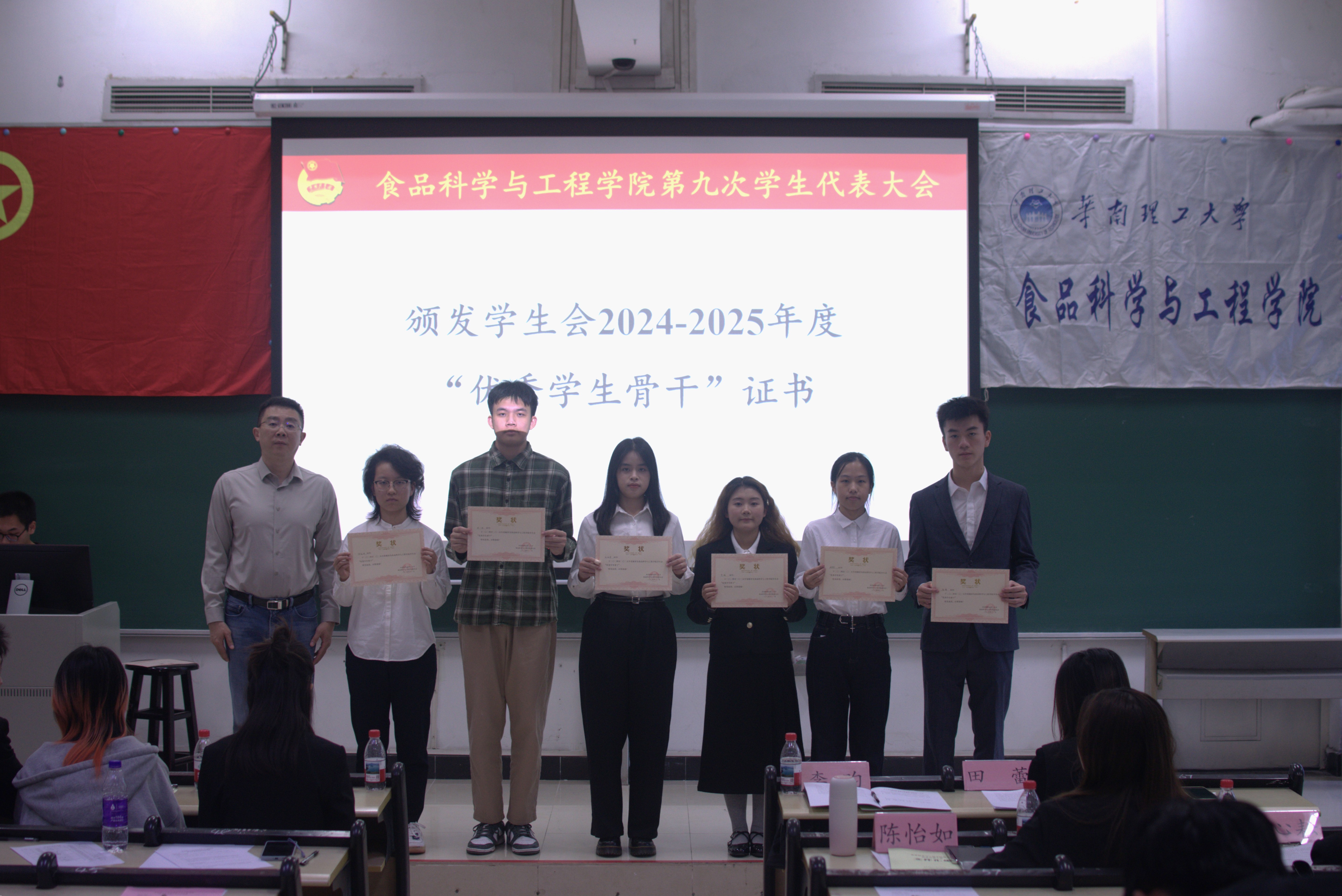 经过10分钟休息后,第九次学生代表大会正式召开。首先,校学生会主席团成员牛渝凯致辞;接着彭心耘宣读《食品科学与工程学院第九次学生代表大会筹备工作报告》,陈怡如宣读《食品科学与工程学院第九次学生代表大会代表资格审查报告》,夏楚丹对食品科学与工程学院第七届学生会工作进行汇报,上述所有文件均经过全场代表审议并通过。随后进行选举环节,彭心耘、夏楚丹宣读并审议《食品科学与工程学院学生会第九次学生代表大会选举办法》、《食品科学与工程学院第九次学生代表大会监票人资格审查报告》及总监票人、监票人名单,然后彭心耘宣读《食品科学与工程学院第九次学生代表大会候选人资格审查报告》。接着华南理工大学食品科学与工程学院第八届学生会骨干候选人依次上台,每人发表竞选宣言,随后工作人员指引现场嘉宾和学生代表有序进行投票。在工作人员统计票数期间,陈怡如宣读关于表彰《华南理工大学食品科学与工程学院学生会2024-2025年度“优秀学生骨干”的决定》,李昀老师为优秀学生骨干颁发证书,接着夏楚丹宣读《关于华南理工大学食品科学与工程学院第七届学生会骨干卸职的确认案》,田蕾老师为学生会骨干颁发聘书。最后彭心耘公布选举结果。