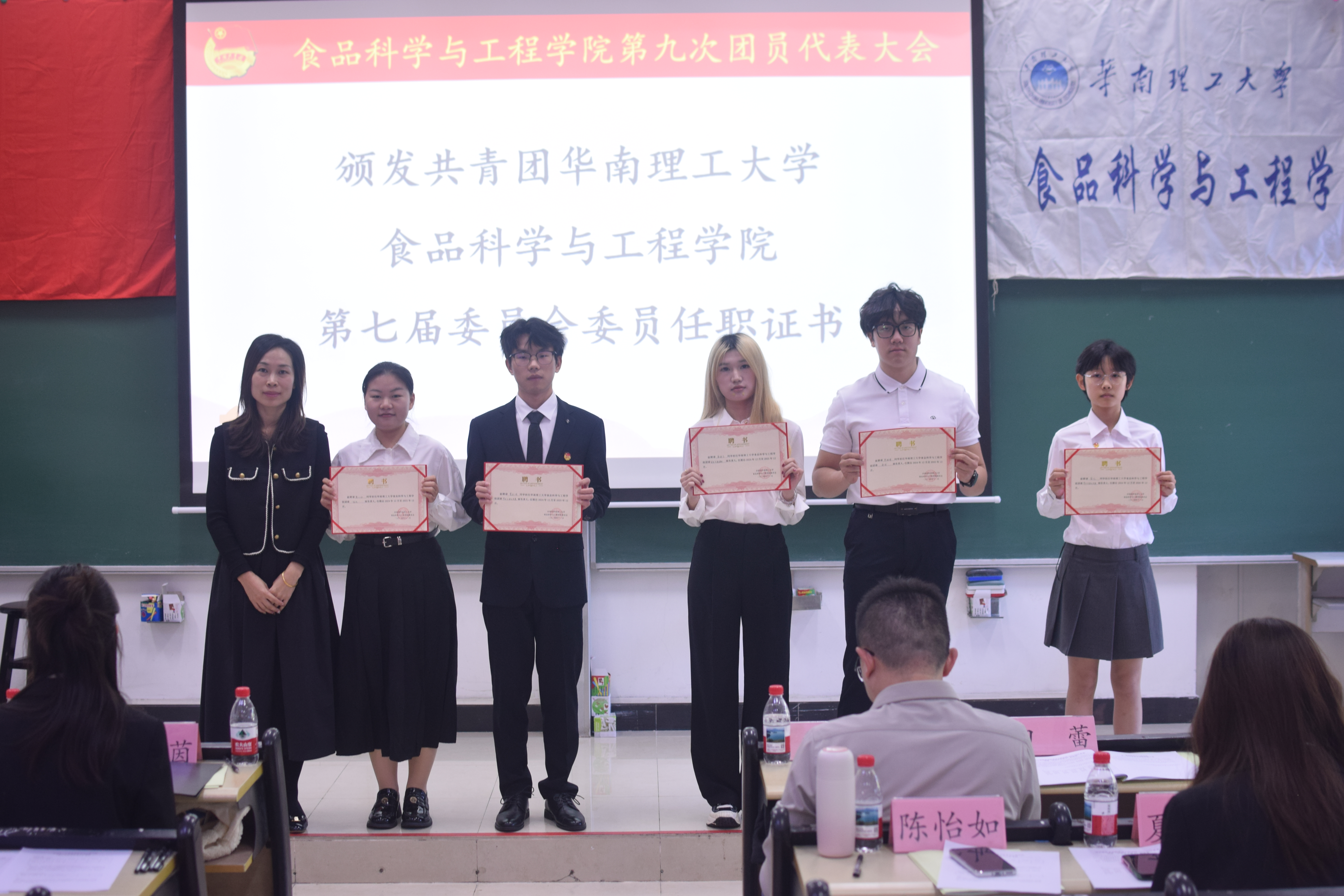 下午两点三十分,主持人陈怡如宣读会议须知,参会人员一起奏唱国歌,第九次团员代表大会正式开幕。首先林嘉琳宣读《食品科学与工程学院第九次团员代表大会筹备工作报告》,随后李茵宣读《食品科学与工程学院第九次团员代表大会代表资格审查报告》,上述所有文件均经过全场代表审议并通过。随后进行选举环节,李茵、林嘉琳、彭心耘分别宣读《食品科学与工程学院第九次团员代表大会选举办法》、《食品科学与工程学院第九次团员代表大会监票人资格审查报告》及总监票人、监票人名单、《食品科学与工程学院第九次团员代表大会候选人资格审查报告》。接着共青团华南理工大学食品科学与工程学院第八届委员会骨干候选人上台,每人发表30秒竞选宣言,总结过去自己的工作,展现自己愿意继续为师生服务的决心。候选人讲话结束后,现场嘉宾和团员代表在工作人员的指引下有序投票。在工作人员统计票数期间,李茵宣读关于表彰《共青团华南理工大学食品科学与工程学院委员会2024-2025年度“优秀学生骨干”的决定》,李昀老师为获表彰者颁发团委2024-2025年度“优秀学生骨干”证书。然后林嘉琳宣读《关于共青团华南理工大学食品科学与工程学院第七届委员会骨干卸职的确认案》,田蕾老师为第七届委员会颁发任职聘书。最后彭心耘公布选举结果,第九次团员代表大会在全体参会人员奏唱中国共产主义青年团团歌《光荣啊,中国共青团》后闭幕。