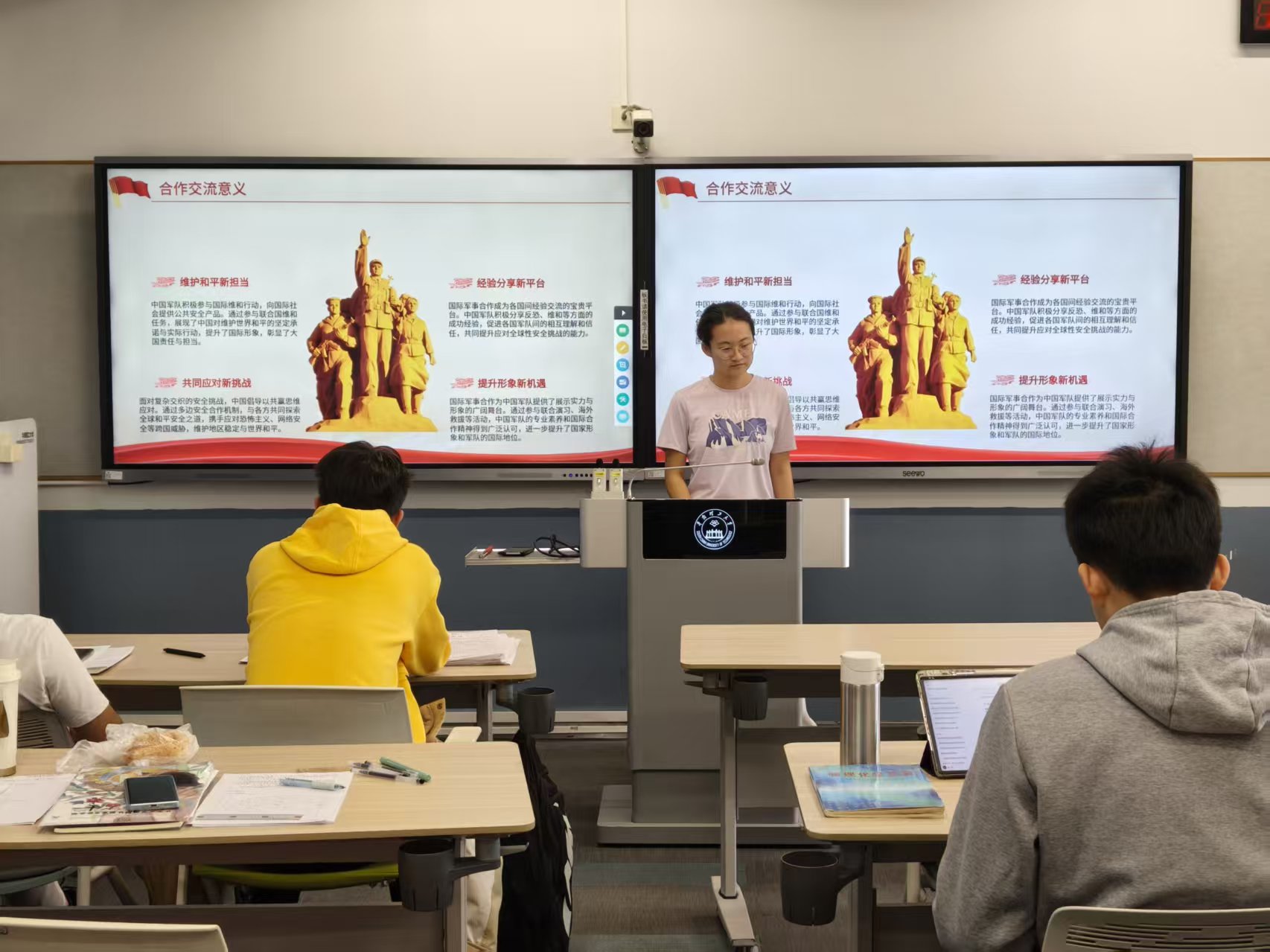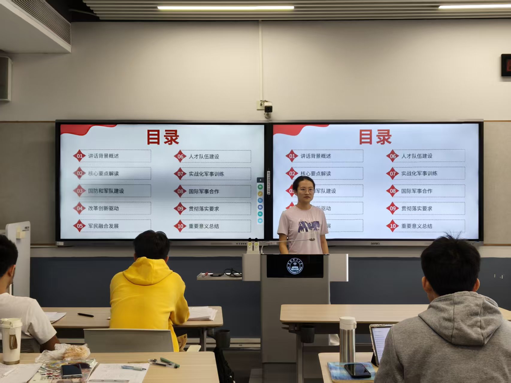 活动在团支书曹萧艺同学的介绍下拉开序幕。曹萧艺同学从讲话背景、核心要点解读、国防和军队建设等十个方面对该谈话内容进行了讲解,并以“学习——讨论——践行”为主线,结合PPT解读国防和军队现代化建设的关键内容,营造“关心国防、支持强军”的班级氛围,激励同学们将爱国情、强军志转化为学习动力,立足专业岗位成长成才,为国家发展和安全贡献青春力量。此外,团支书还结合食品专业特色,引导同学们思考青年在“科技强军、军民融合”中的责任担当,如食品营养在军事后勤保障中的应用、食品科技在应急物资储备中的价值等,实现理论学习与专业认知的深度融合。同学们感触颇深,纷纷表示要努力学习专业知识,为国家安全建设奉献出食品人的力量。