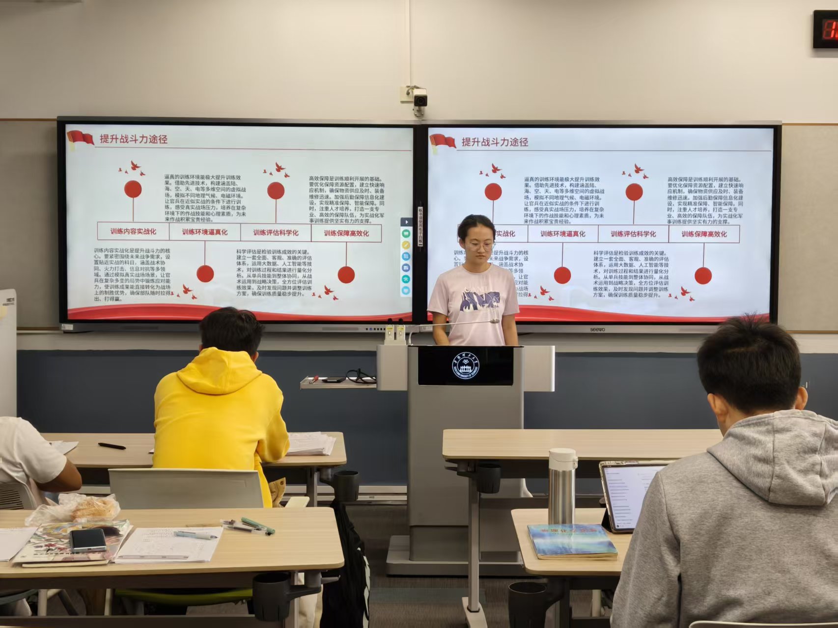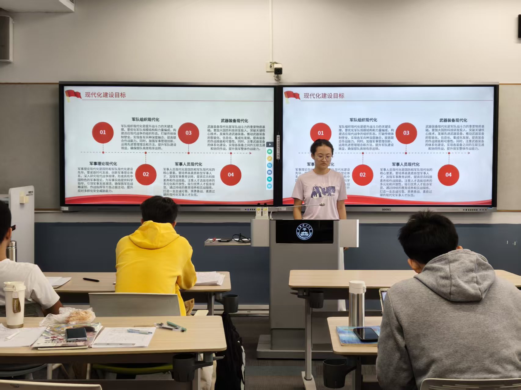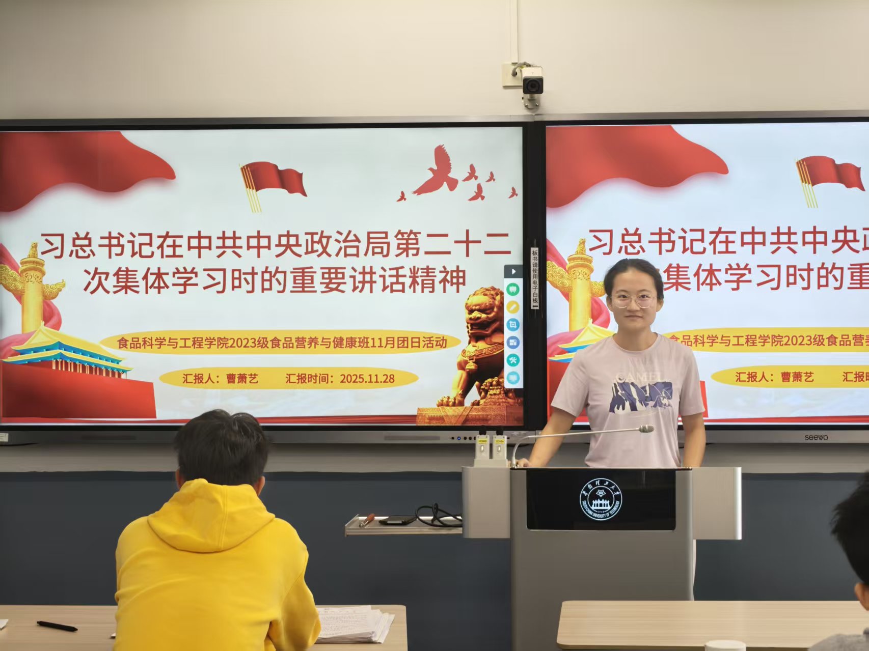 当前世界百年未有之大变局加速演进,国家安全面临多重挑战。习总书记在中共中央政治局第二十二次集体学习时的重要讲话,深刻阐明了“强国必须强军、军强才能国安”的核心要义,为国防和军队现代化建设指明了方向。作为食品学院青年学子,当以专业所学锚定家国所需。基于此背景,2025年11月28日10时45分,华南理工大学食品科学与工程学院2023级食品营养与健康班团支部于五山校区330308课室开展主题为“学强军思想,筑食安担当”的团日活动,将理论学习与专业特色结合,引导青年在思想淬炼中筑牢责任担当。