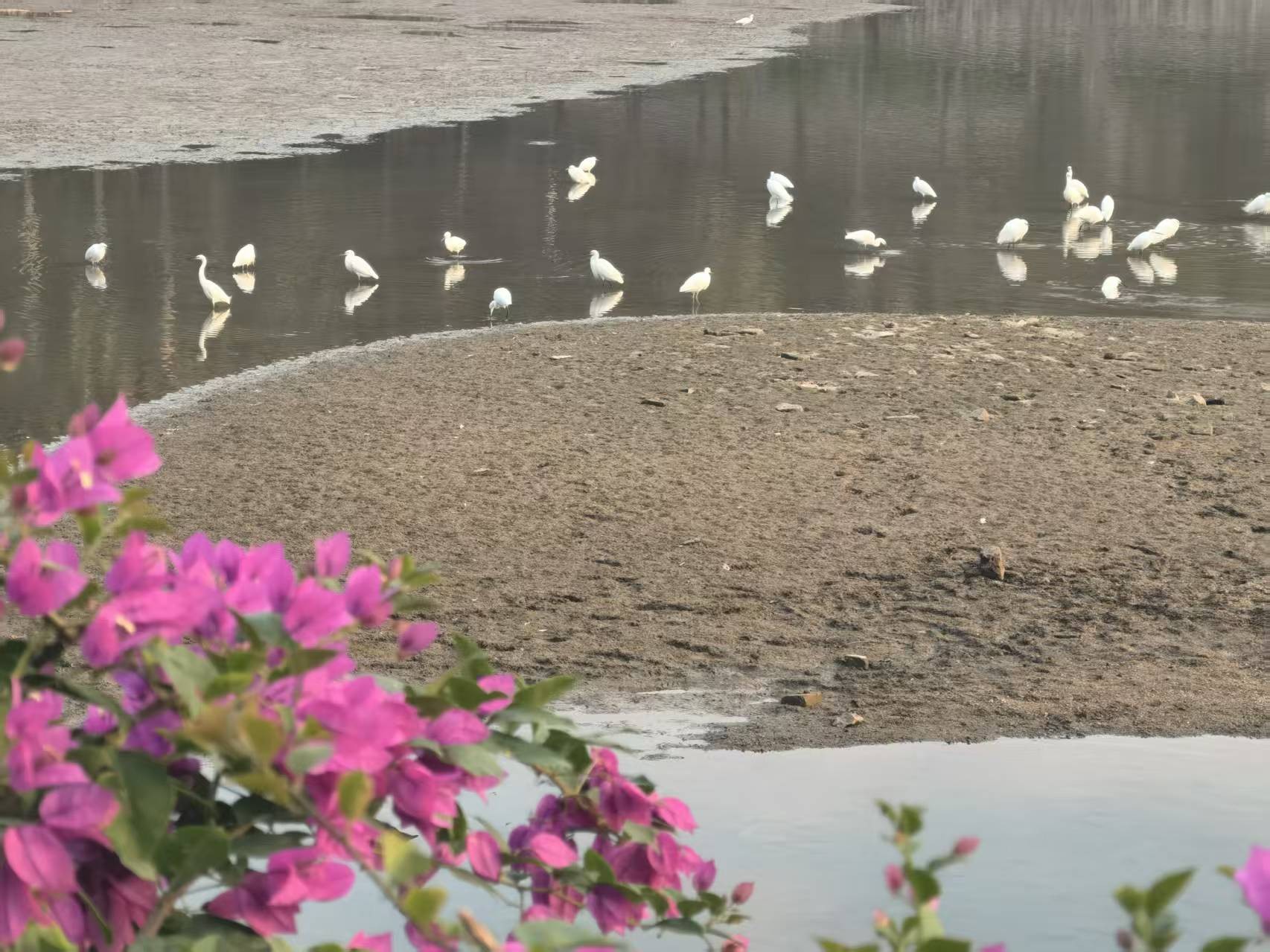 随后,团员们以小组为单位开启探索:有的蹲身细察三角梅的瓣形与色泽,用手机镜头捕捉露珠滚落的瞬间;有的沿湖边驻足,记录黑天鹅划水的轨迹,交流水禽的生活习性;还有的对照植物图鉴,辨识行道树的种类与生长特点,在“观察—查询—分享”的过程中,将课本里的生态知识转化为可触可感的实践认知。