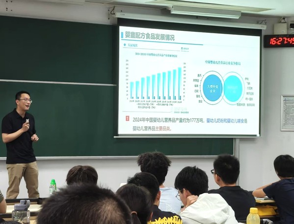 第一次讲座以“生命早期营养与健康”为题,由张斌教授主讲。张教授讲解了肠道菌群的由来、健康作用及与人体免疫的关系,结合 “健康中国”战略阐述该领域前景及婴幼儿配方食品市场特点,并通过骨桥蛋白研究解析科研面貌,构建起从基础原理到科研实践、产业应用的完整认知体系。