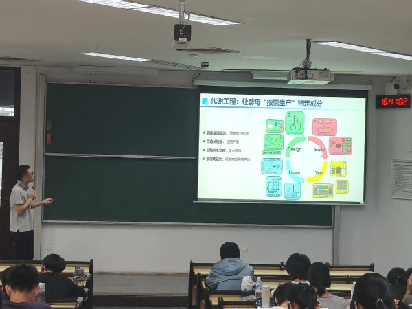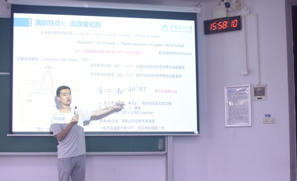 第三次讲座,曹宇飞教授以“‘酶好未来’——绿色生物制造芯片的多尺度设计”为题。他首先介绍酶作为生物大分子的催化剂本质,通过过渡态理论及葡萄糖氧化、钠与水反应等实例对比,阐释酶的高效性,随后结合自身科研经历,说明研究酶的缘由,阐述研究酶的意义,讲解酶的研究与创造方法,构建起从理论认知到实践创新的完整知识体系。