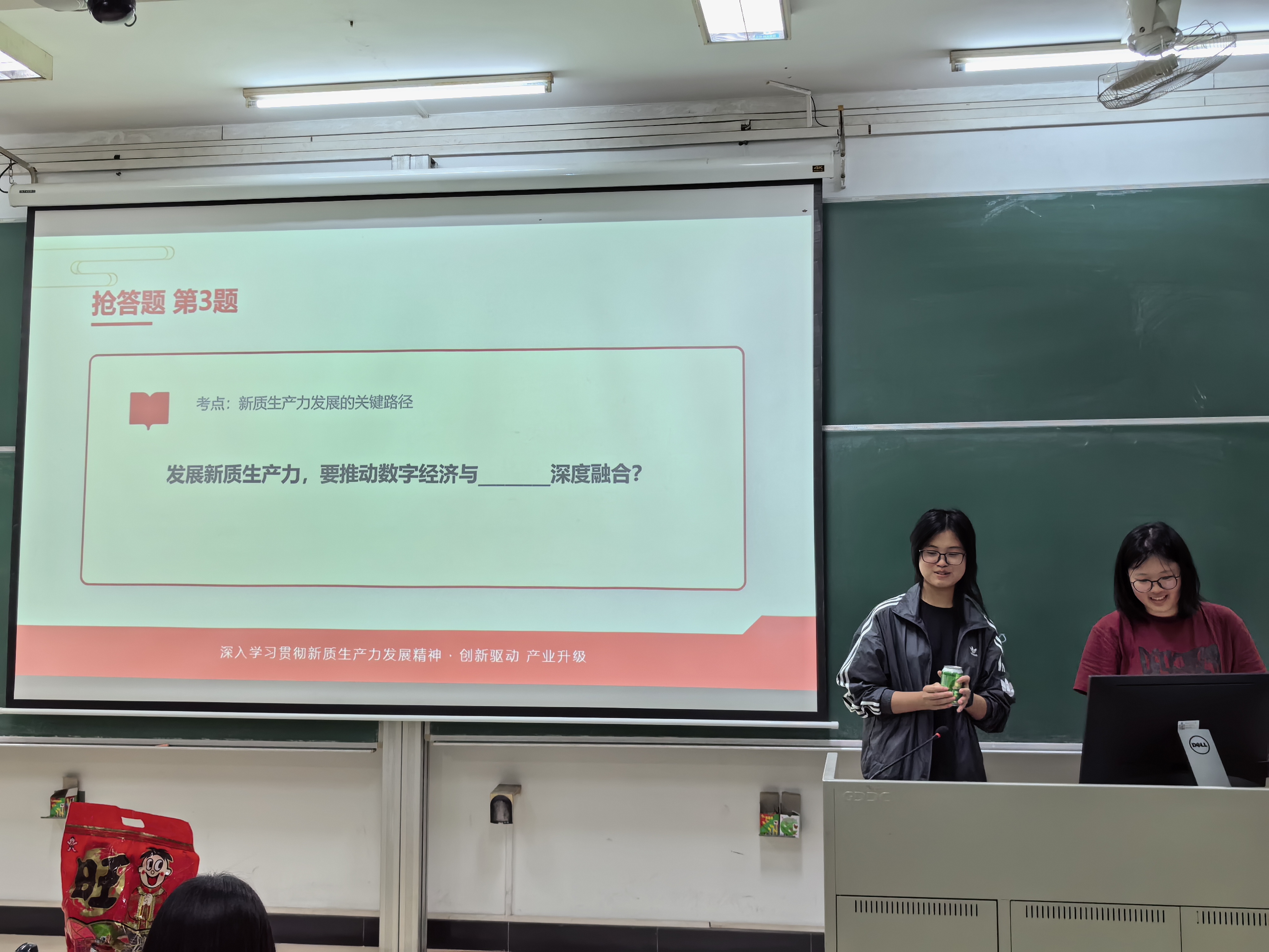 为深入学习2026年全国两会精神,引导团员青年深刻理解新质生产力的科学内涵,提升团支部凝聚力与战斗力。2026年3月25日,食品科学与工程学院2024级食品科学与工程一班与二班团支部于华南理工大学五山校区330503教室联合组织了本次“高举团旗跟党走,奋进新质生产力”3月团日活动。参加本次活动的是两支部的全体同学。
