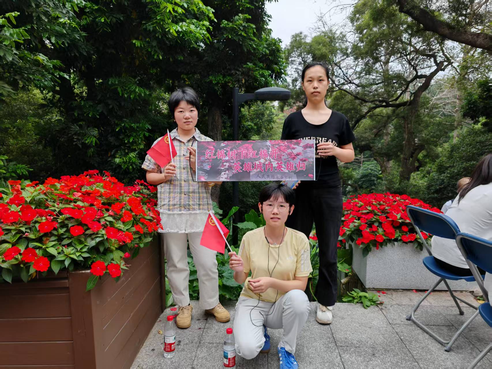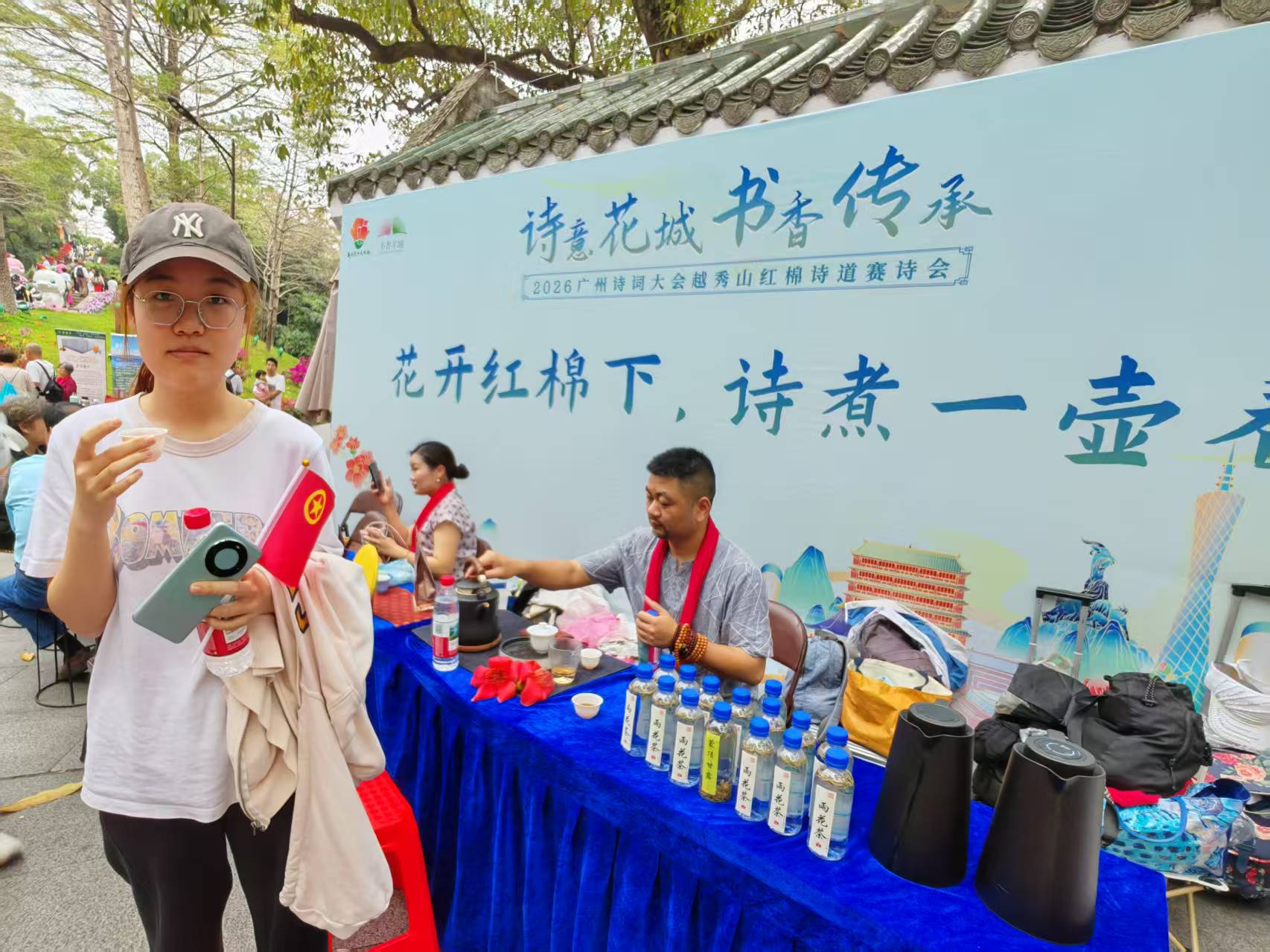 随后,同学们来到百步梯旁的红棉茶会现场。百席茶席依红棉而设,茶艺师以越秀公园新鲜落花为原料,经十余道工序精制而成的木棉花茶,汤色清亮、甘醇回甘。大家围坐茶席,以茶为媒、以诗会友,分享红棉诗词、交流创作感悟,结合专业学习与生活实践,畅谈新时代青年的使命担当。茶香、花香、诗香交织,让红色文化在温润氛围中入脑入心。