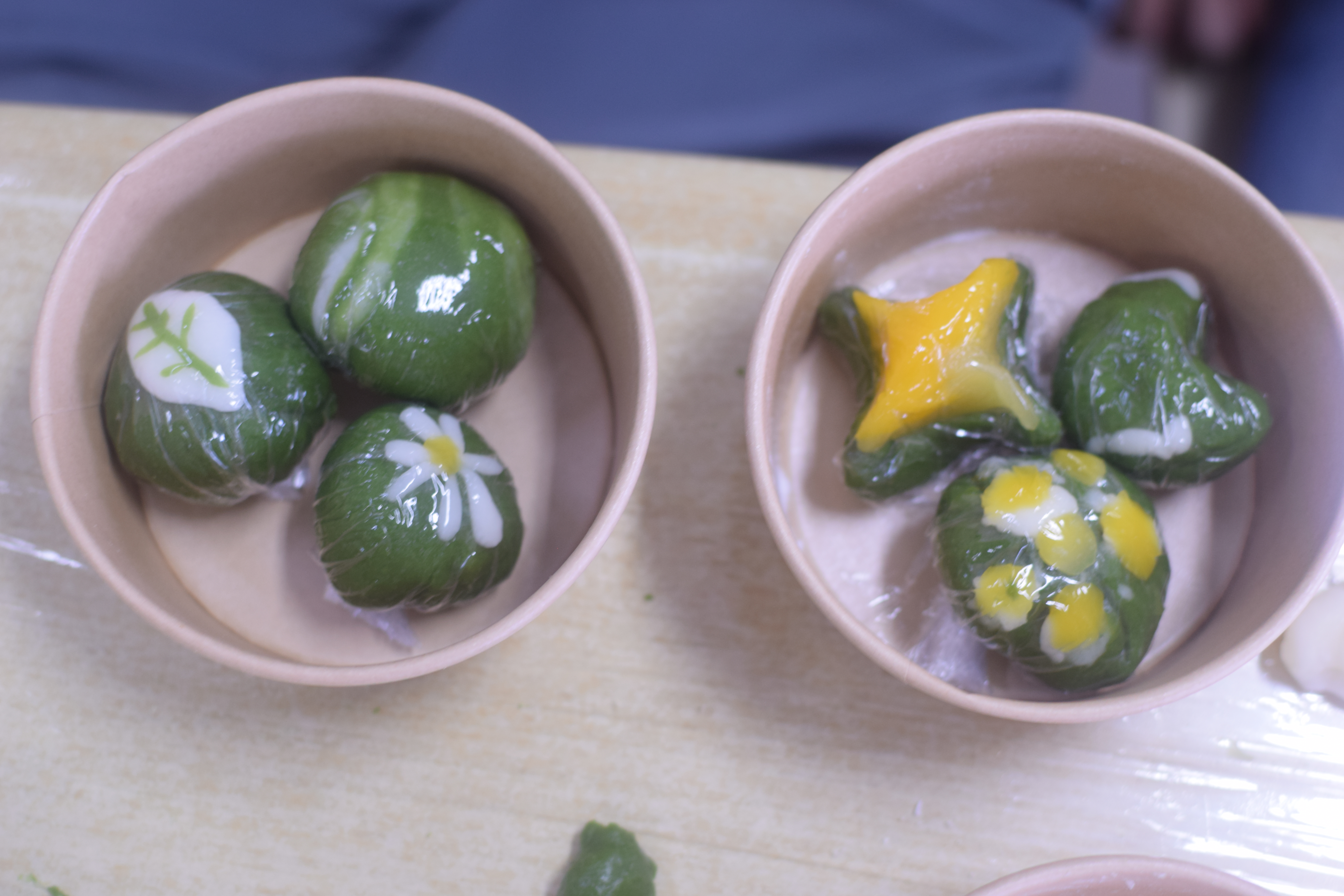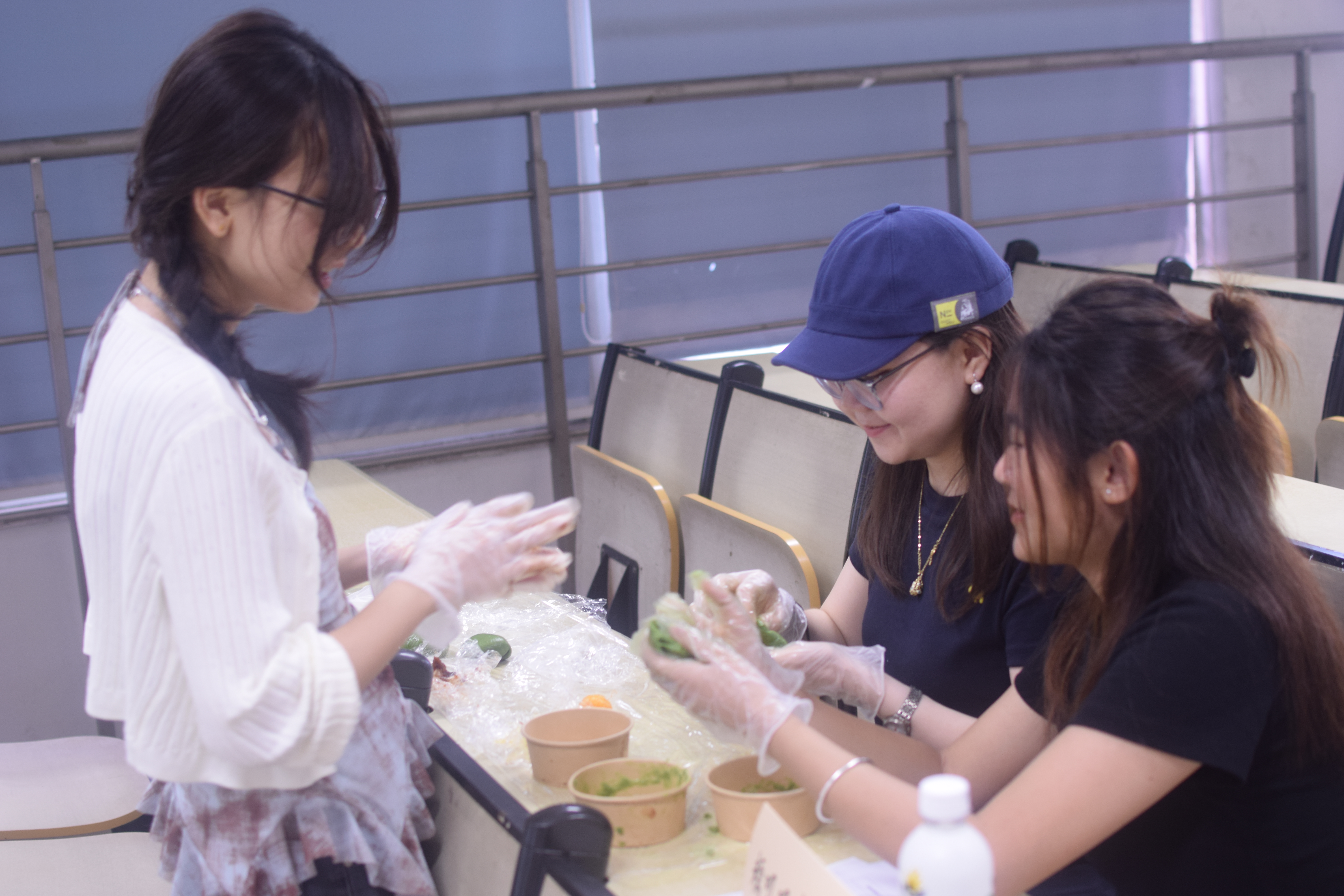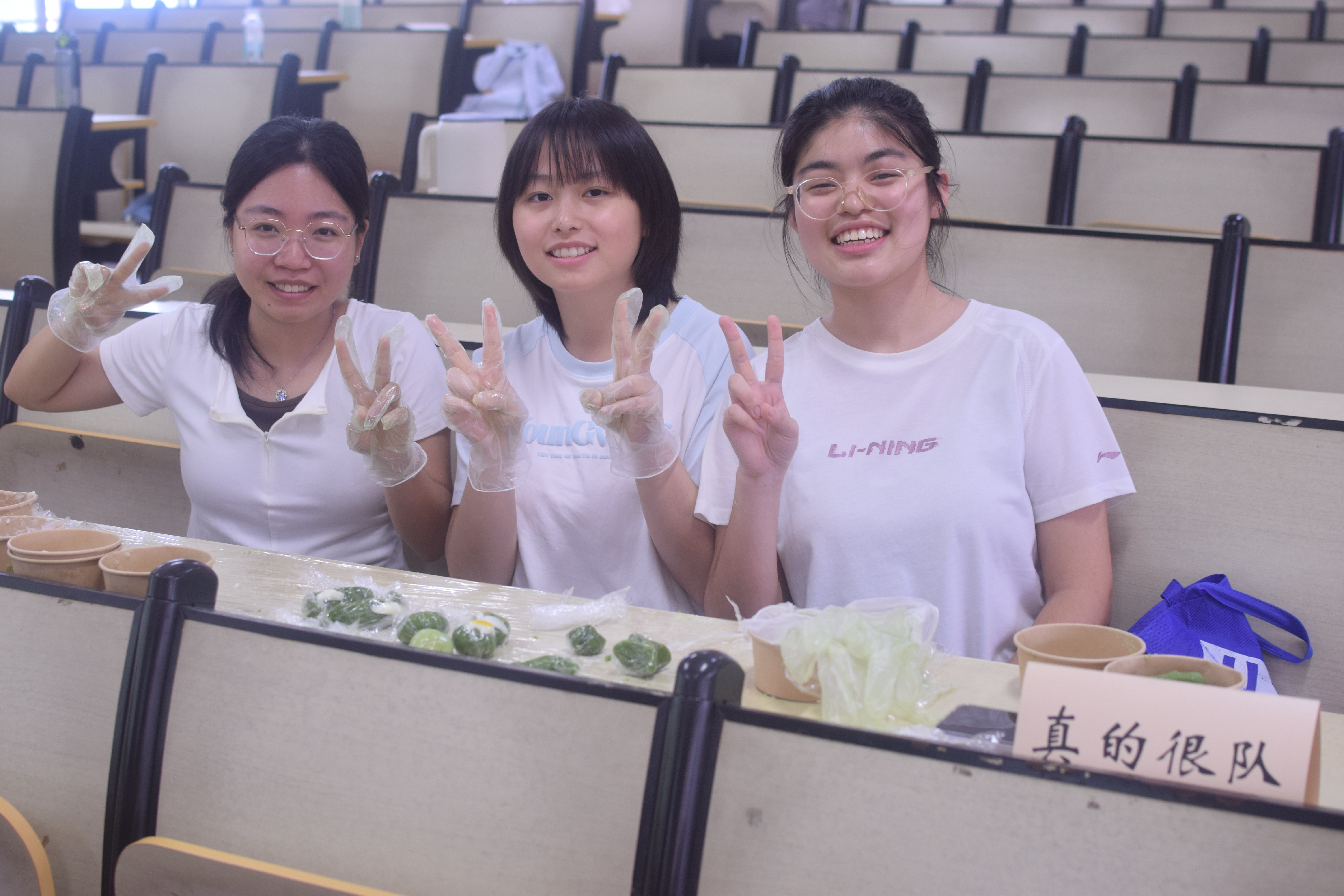 随后,活动进入核心环节——沉浸式青团手作环节。在观看教学视频后,各小组有序领取莲蓉、豆沙、奶黄馅料,开始了限时40分钟的手作体验。同学们巧妙运用视频所学,精心揉捏、包馅、塑形,在协作中探讨食品科学的实际应用,指尖翻飞间,一个个饱含“生机”与“团圆”寓意的青团逐渐成型,现场洋溢着专注与欢快的春日气息。