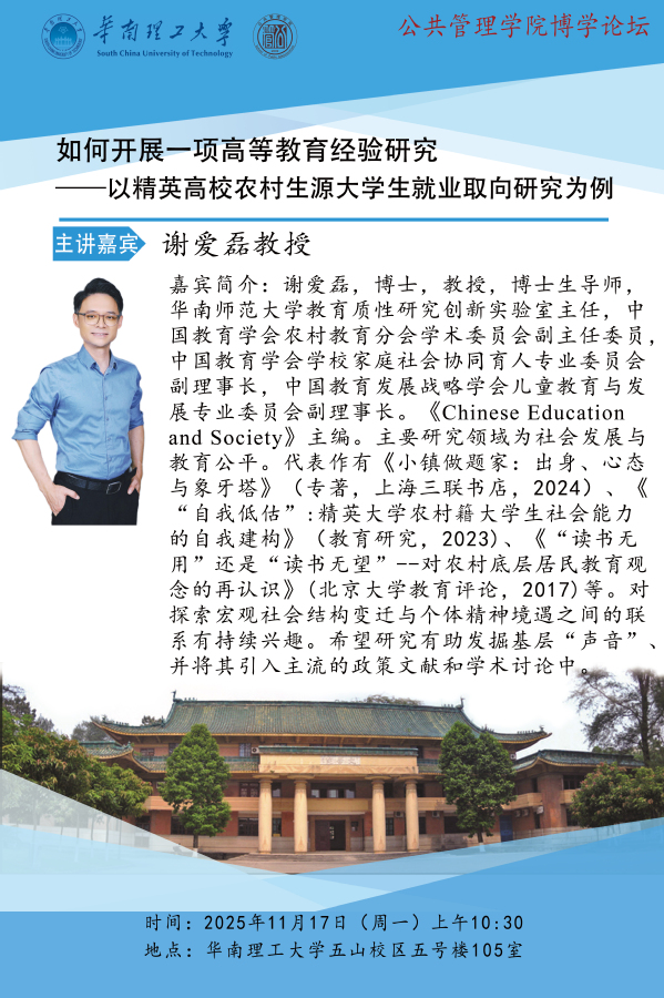 【讲座预告】如何开展一项高等教育经验研究——以精英高校农村生源大学生就业取向研究为例 2025年11月17日上午10:30