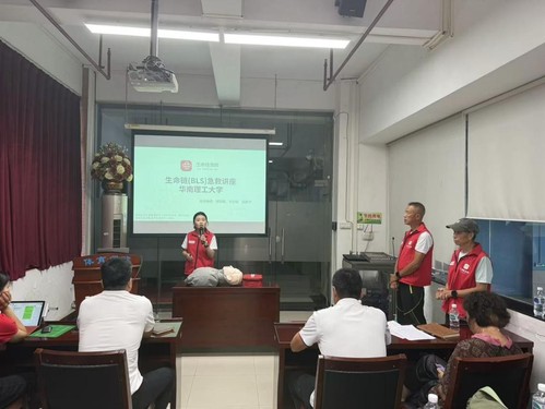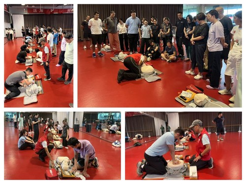 本次培训分为理论讲习与实操练习两部分。广东省红十字会生命链急救团队介绍了急救的基本概念,说明了如何判断心脏骤停、如何确认现场环境并进行呼救,讲解了心肺复苏和海姆立克腹部冲击法的救援流程,并利用心肺复苏模型讲解胸外按压、气道开放、人工呼吸的基本要领,以及自动除颤仪(AED)的使用方法。
