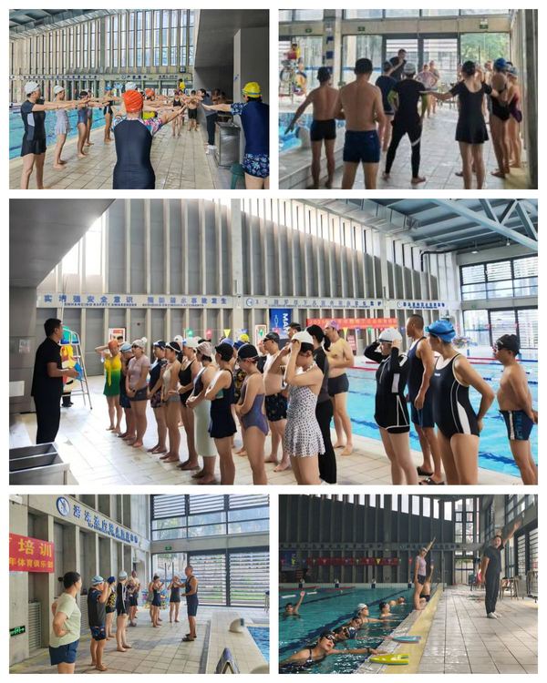 五山校区道明游泳馆内的氛围同样热烈。“游泳是最友好的全身性运动,既能强化心肺功能,又能在水的缓冲中保护关节。”学院副院长张瞻铭在开场讲话中,生动诠释了这项运动对职场人群的独特价值。考虑到教职工游泳基础参差不齐,体育学院教师陈秀君、张雷、梁冬冬、全龙等教学团队贴心设计了分层教学:先带领大家完成系统的下水前热身,再针对初学者重点讲解换气与漂浮技巧,为有游泳基础的教职工指导提速与姿势优化,细致入微的安排让每位参与者都能在水中找到属于自己的节奏。