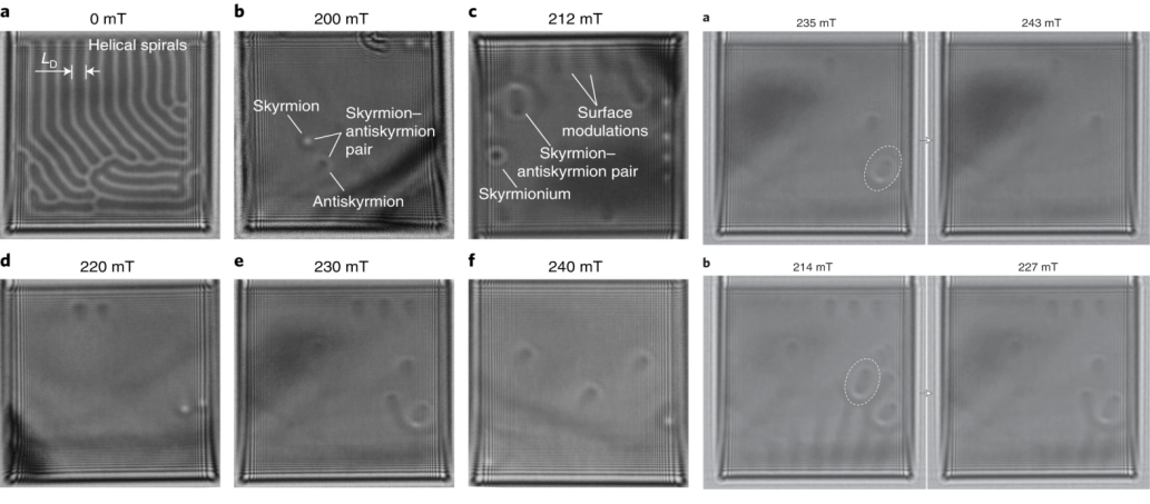 近日,由华南理工大学自旋科技研究院郑风珊教授课题组、德国于利希研究中心先进模拟研究所Nikolai S. Kiselev博士课题组和Ernst Ruska-Centre Rafal E. Dunin-Borkowski教授课题组领导的合作研究团队,利用高空间分辨透射电镜磁成像技术,在超薄各向同性铁锗合金中发现了反磁斯格明子,磁斯格明子-反磁斯格明子对(粒子-反粒子对)及其湮灭,相关成果以Skyrmion–antiskyrmion pair creation and annihilation in a cubic chiral magnet为题发表在期刊《自然-物理》(Nature Physics)上。