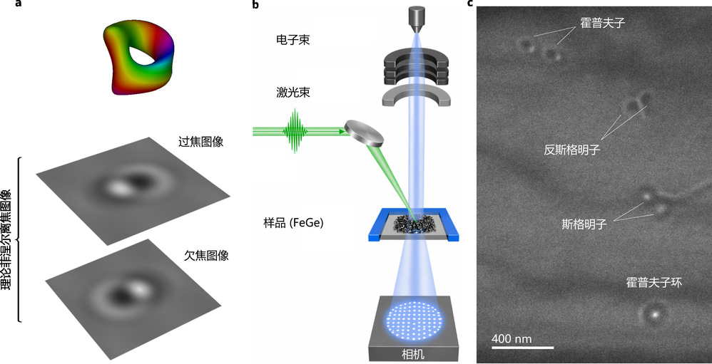 图. a, 孤立霍普夫子的磁构型示意图及其理论菲涅尔离焦电镜图像;b, 原位超快激光洛伦兹透射电镜示意图;c, 超快激光脉冲诱导多种拓扑磁孤子形核。