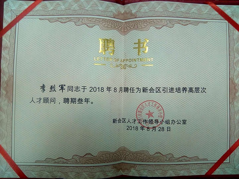 ▲李烈军教授被聘为新会区的人才顾问,图为人才顾问证书