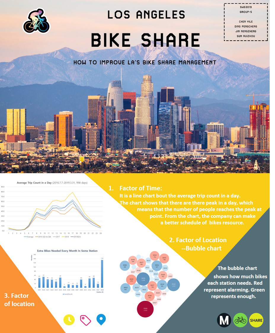 课题使用一段时间内洛杉矶地区共享单车使用始末时间、始末坐标等信息为素材,从可能影响用户使用单车的因素如时间、地点、销售策略等方面进行了分析,为进一步优化共享单车公司的管理提出了一系列建议。