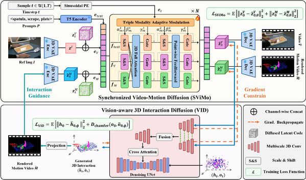 论文概要:基于手物交互2D视频与3D动作本质上共享着真实世界的物理动力学基础这一动机,该工作提出一种视频-动作共生框架,能够从参考图像与文本指令中同时生成手物交互视频与对应的动作序列。方法上,首先通过一个同步扩散模型将视频生成与运动合成统一于联合去噪过程中,有效融合视觉先验与运动学约束。其次,引入视觉感知的3D动作扩散模型,生成显式动作序列,并与同步扩散模型形成闭环反馈机制,从而增强视频与动作之间的一致性。此外,为更好地整合文本语义、视觉外观与运动动态的异构特征,该工作提出三模态自适应调制机制进行特征对齐,并采用三维全注意力机制以挖掘深层特征关联。