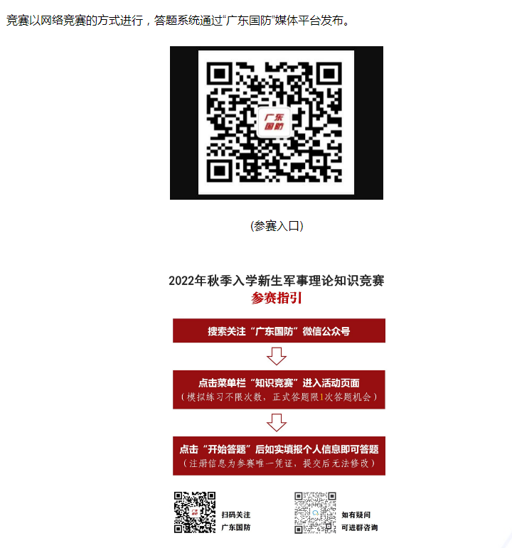 根据国务院办公厅、中央军委办公厅《关于深化学生军事训练改革的意见》和广东省人民政府办公厅、广东省军区战备建设局《广东省深化学生军事训练改革实施办法》,为积极推进学校国防教育和学生军事训练改革,适应新时代、新特点、新要求,广东省教育厅、广东省人力资源和社会保障厅、广东省军区战备建设局决定联合组织全省普通高校2023年秋季入学新生军事理论知识竞赛。现将有关事项通知如下:
