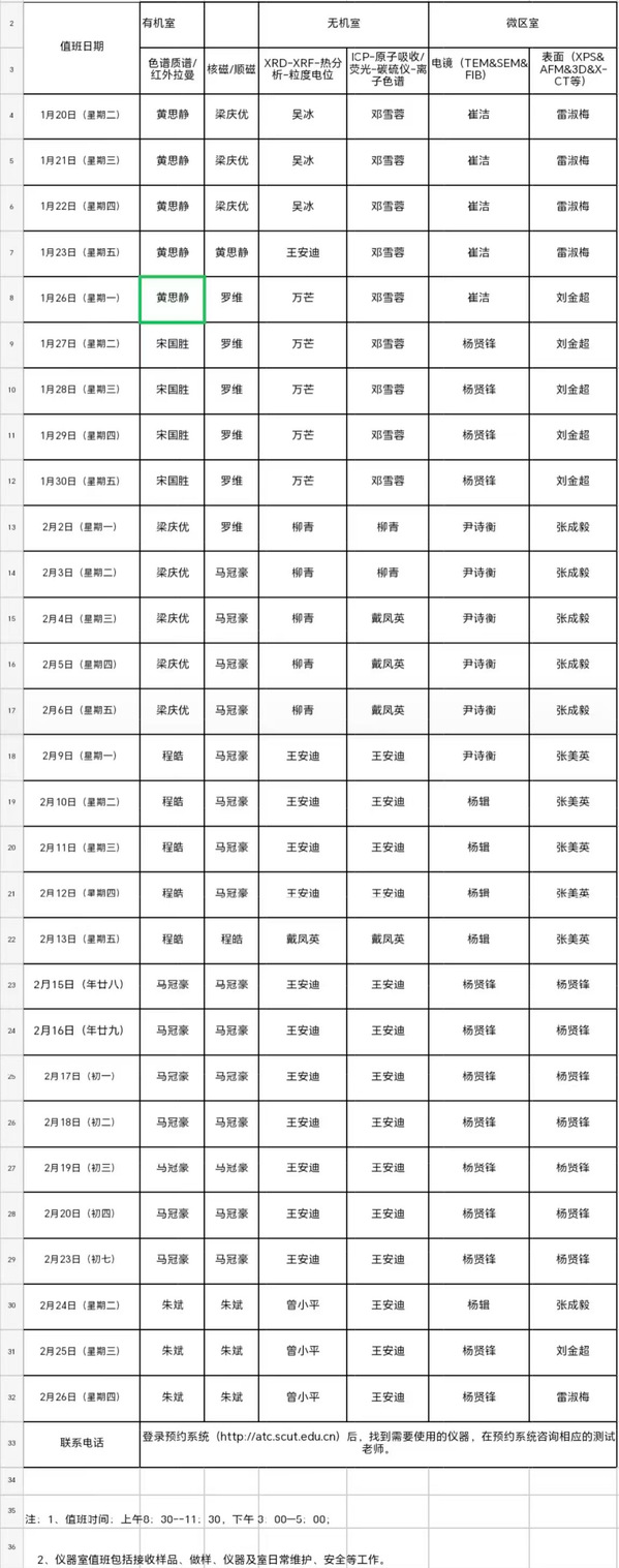 根据学校安排,2026年放寒假时间为1月20日—2月26日,为方便广大师生假期测试样品,分析测试中心各仪器室均安排老师值班,具体安排详见附件。